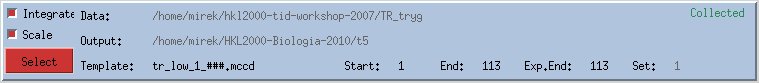 In this exercise you will be working with an X-ray diffraction data set collected for a single crystal of trypsin at DESY (Deutches Elektronen Synchrotron) in Hamburg by dr Szymon Krzywda. The data directory contains 113 raw diffraction images recorded to the maximum resolution of 2.15 Å. The wavelength of the X-ray radiation used was 0.81600 Å, and the detector was a MAR Research CCD device with 165 mm diameter. The experiments were carried out at beamline X11 belonging to the EMBL (European Molecular Biology Laboratory).